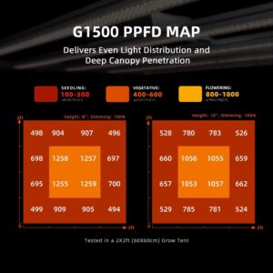G-seeria on meie uusim eelarvesõbralik tootesari, mis sobib ideaalselt kasvatajatele, kes soovivad saada tippklassi tulemusi taskukohase hinnaga. Sellel seerial on kõige suurem LED-ide tihedus meie tootevalikus, pakkudes suurepärast valguse tungimist ja erakordselt ühtlast katvust. Kõrge tihedusega LED-id tarbivad iga dioodi kohta vähem energiat, muutes valgustid energiatõhusamaks ja vähendades soojuseraldust. Vaadake PPFD-kaarti, PPF-i ja PPE-andmeid — G-seeriaga saate tipptasemel tulemusi murdosa hinnaga. Kasvatajad teatavad sageli, et saagikus on üle 1,5x suurem kui HPS-lampidega, ning kvaliteet on märkimisväärselt parem — ja see pole sugugi haruldane nähtus.
