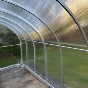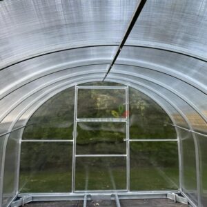- Avar disain: Kaare kõverdumine algab 1 m kõrguselt maapinnast (mitte 0,5 m nagu enamikul mudelitel), võimaldades kasutada külgset ruumi tõhusamalt. Kokku ulatub kasvuhoone kõrgus alusega 2,13 m-ni.