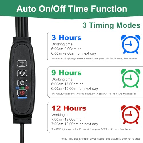 Kasvatuslamp sisaldab 3/9/12-tunnilist taimerit, mis võimaldab taimedele anda täpse valgusekestuse, takistades valguse üle- või puudujääki. Peale taimeri seadistamist lülitub lamp õigetel aegadel automaatselt sisse ja välja, mis teeb selle ideaalseks kasutamiseks siis, kui olete tööl või puhkusel.