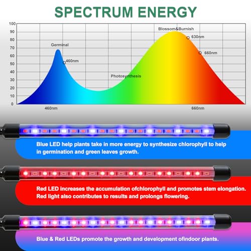 See LED-taimelamp sisaldab kokku 80 kvaliteetset LED-dioodi: 52 punast LED-i ja 28 sinist LED-i. Need spektrivahemikus 630-660 nm (punane) ja 400-470 nm (sinine) valgusdioodid on äärmiselt tõhusad fotosünteesi toetamiseks, soodustades taimede seemnete idanemist, kasvu, õitsemist ja viljumist.