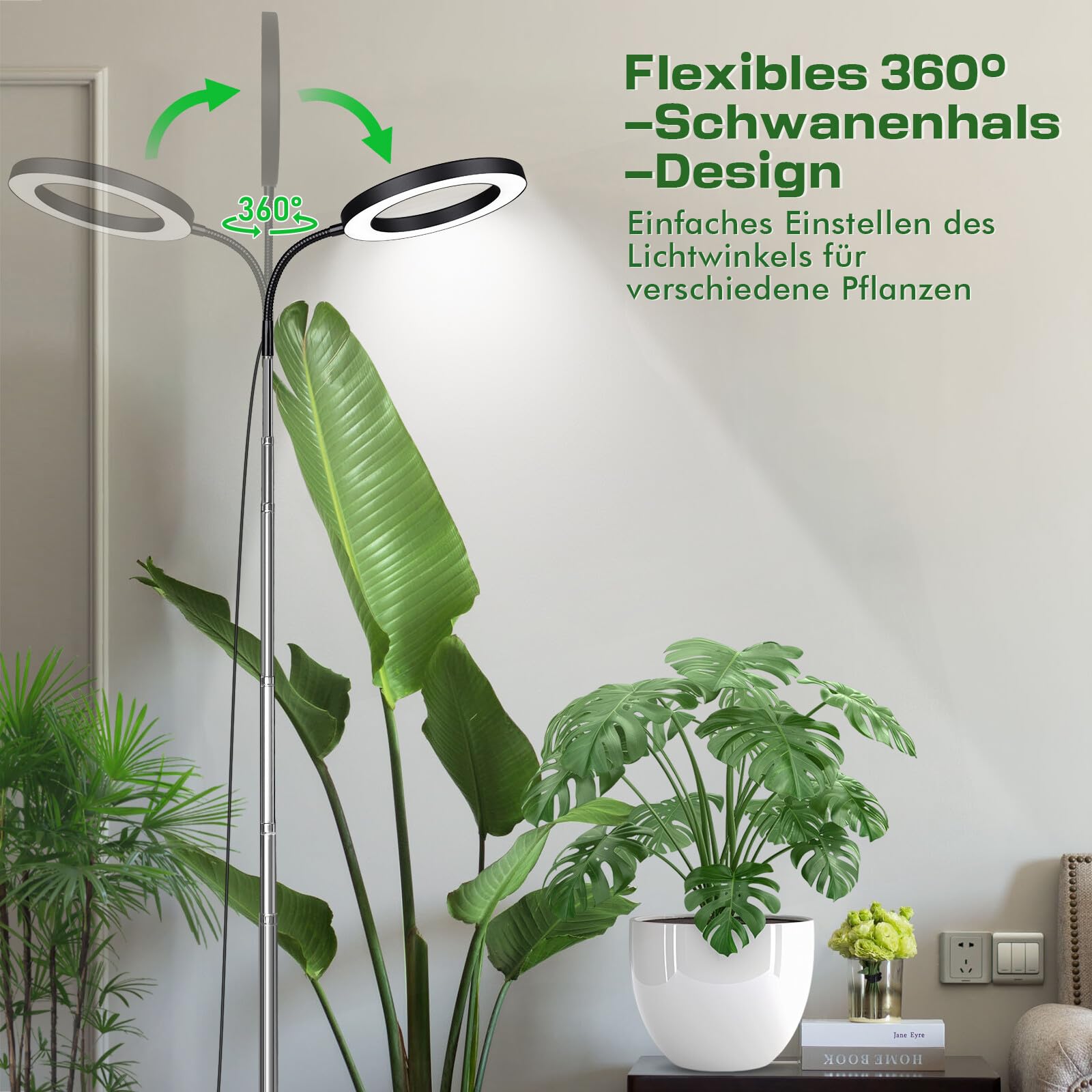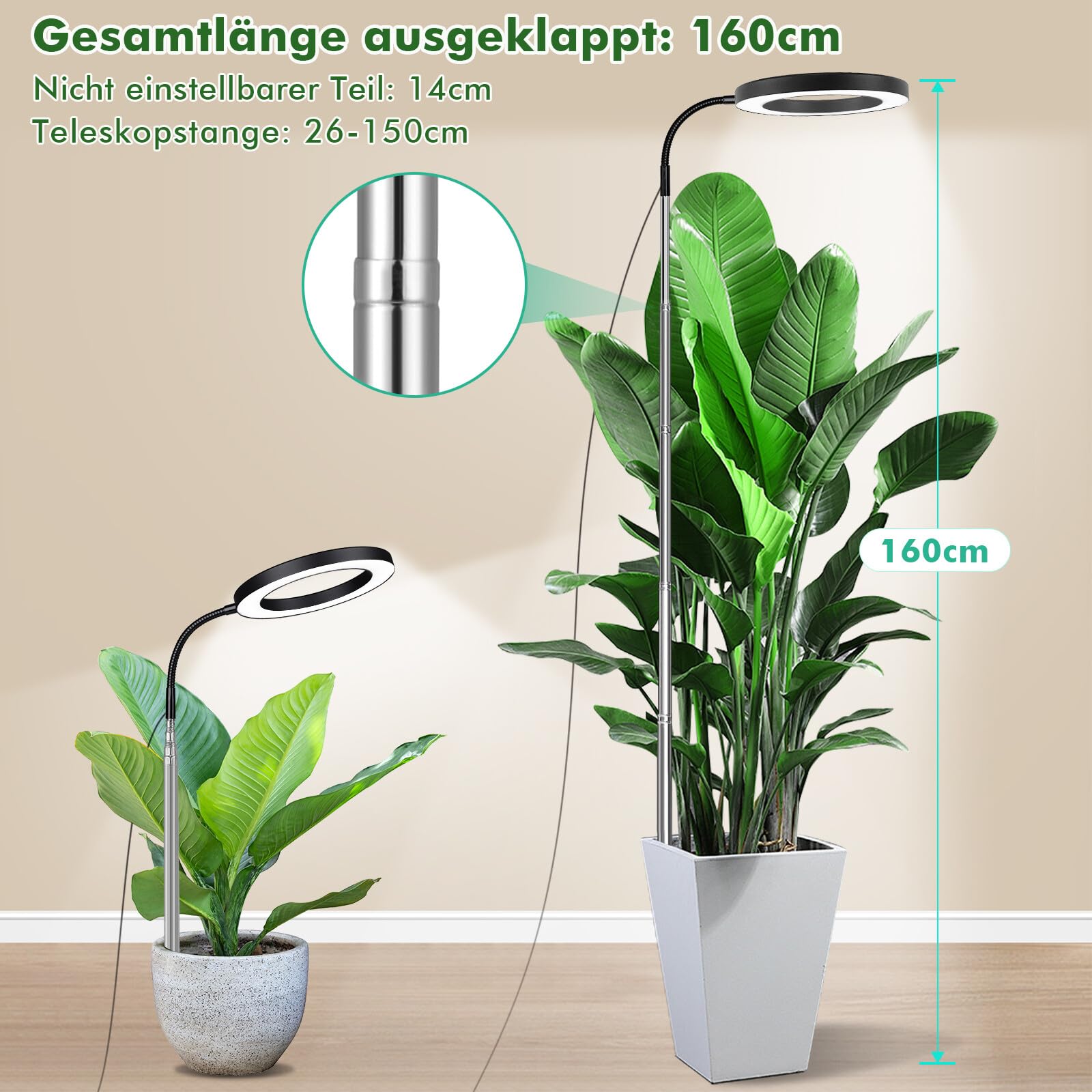 See LED-taimevalgusti on varustatud 360° painduva kaelaga, mis võimaldab valgust suunata täpselt sinna, kus taimed seda kõige rohkem vajavad. Lisaks saab lambi kõrgust reguleerida 35 cm kuni 160 cm, et tagada optimaalne valgus ka kõrgematele taimedele.