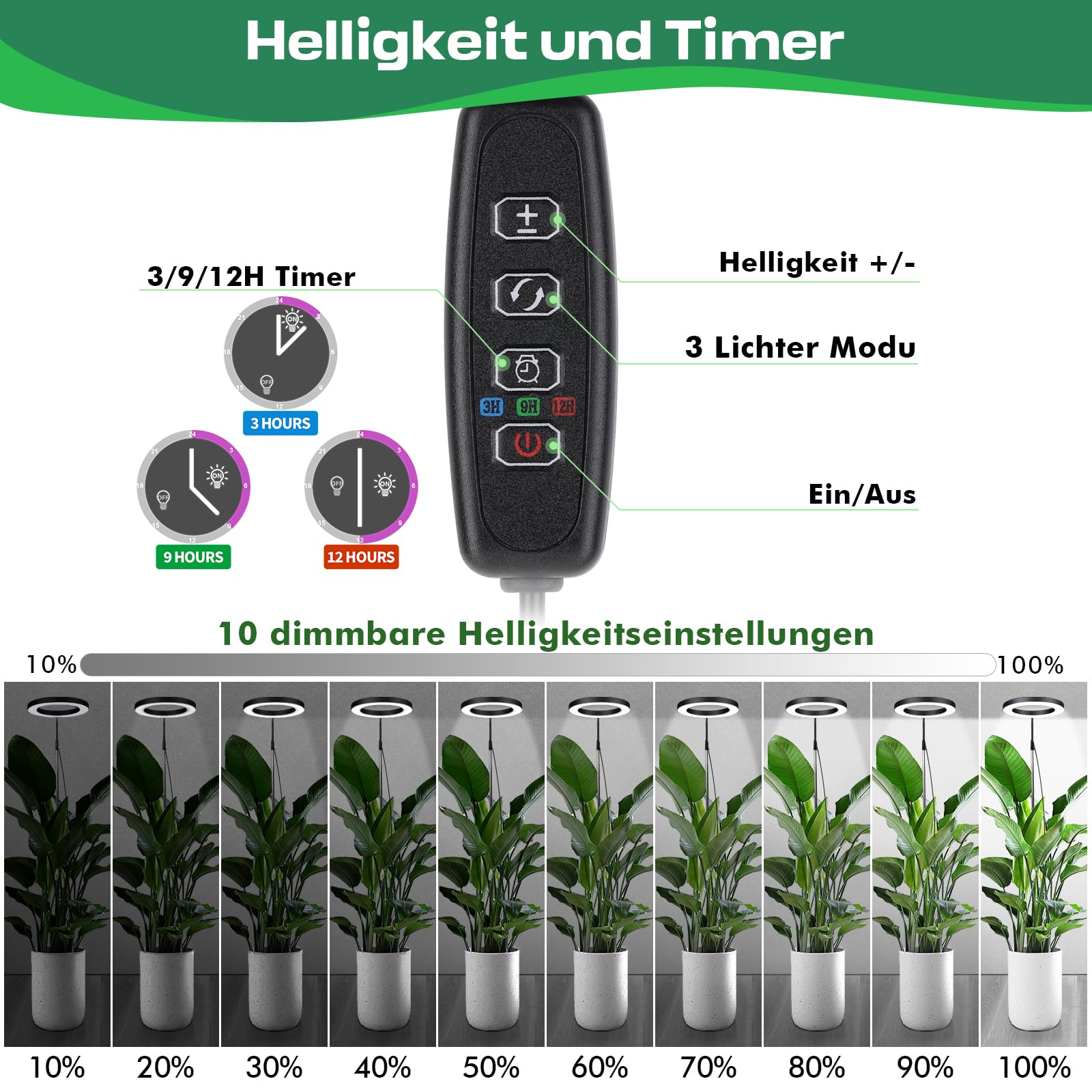 LED-taimelamp sisaldab 3/9/12-tunnist taimerit, mis tähendab, et saate määrata täpse tööaja ilma iga päev valgust käsitsi sisse ja välja lülitamata. See aitab taimedel saada regulaarselt vajalikku valgust ning soodustab tervislikku kasvu.